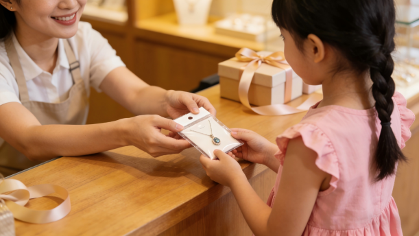 店主认真地听完,拿出了那条项链,装在一个精致的小盒子里,用一张漂亮的红色包装纸包好,还在上面系了一条绿色的丝带。然后对小女孩说:“拿好啊,小心点。”说完拍拍小女孩的头,微笑着目送小女孩满心欢喜、连蹦带跳的身影回家去。