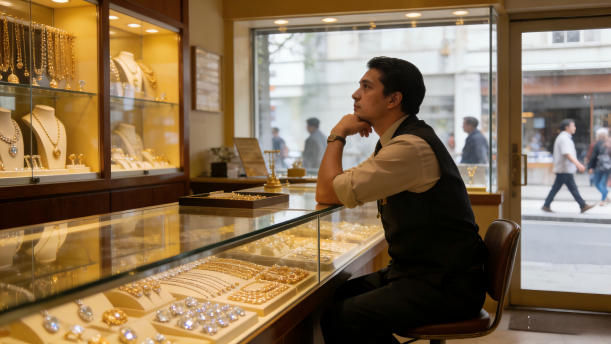 店主站在柜台后面,百无聊赖地望着窗外,心里却盘算着最近一直不太景气的生意。