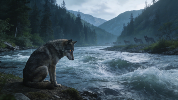 而当我独自沿着这条河,巡查我们这个狼群的领地时,我便会停下匆忙的脚步,久久地蹲坐在岸上,看它无羁无绊、浩浩荡荡潇洒地远去,总觉得它会把我那些颠三倒四、不是一只狼所应该有的思绪带走,带走……