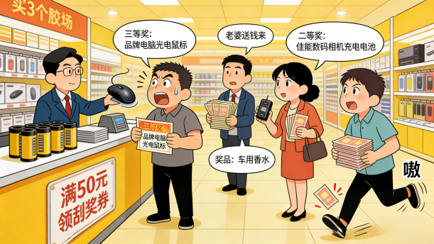 张石头那台傻瓜相机中的胶卷没了,他去商场买胶卷。商场正在搞有奖销售活动,顾客买商品满50元就可以领到一张刮奖券。张石头买了3个胶卷,领到了一张刮奖券。刮开一看,呵!运气不错,是个三等奖。