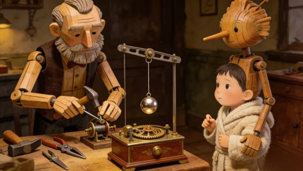 发条上足的木偶之一——我的父亲在房间里忙碌,拿过来锤子叮叮当当,拿过来起子叮叮当当,拿过来钳子叮叮当当,这一切的叮叮当当都是无声的。而他忙碌的主要目标是一具由钢丝吊在单轨架上的金属撞球,这玩意儿理论上在反复撞击中可以一直撞击下去,他试图把它联动上一具本该由发条驱动的八音盒,以证明上述的那个理论。这是个很复杂的工序,但我父亲擅长让一切复杂起来。