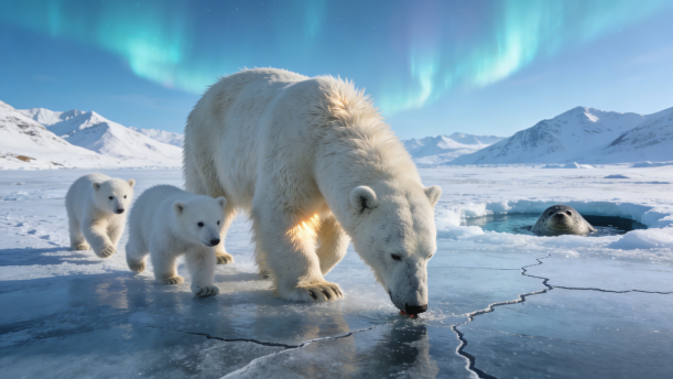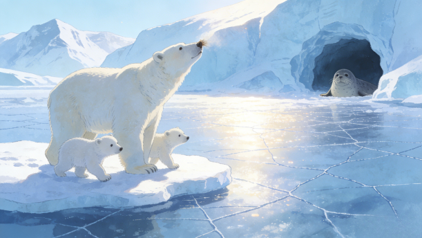 我叫熊萌萌,我是一只北极熊,跟着妈妈和哥哥一起在北极生活。北极是我的天堂,这里有连绵的雪山,有漂亮的极光,还有许多好吃的。妈妈每天带着我和哥哥出去边找好吃的边玩耍,我最喜欢在雪地上打滚了。