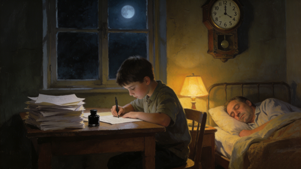 一天早上,父亲对他说:“叙利奥!你怎么啦?你和从前相比,不是变样了吗?注意呀!一家人的希望都在你身上呢,你不知道吗?”叙利奥出世以来第一次挨骂,心里很难受。他想:“不能做下去了,非停止不可。”可是这一天晚饭时,父亲很高兴地说:“这个月比上个月多挣了六元四角钱呢!”他从抽屉里拿出一袋糖果来,说是买来庆贺一下的。孩子们都很高兴。叙利奥也重新振作起来,暗暗对自己说:“还是继续下去。白天多用功,夜里仍旧工作吧!”父亲接着说:“只是这个孩子——”说到这里指着叙利奥,“他实在使我伤心!”
