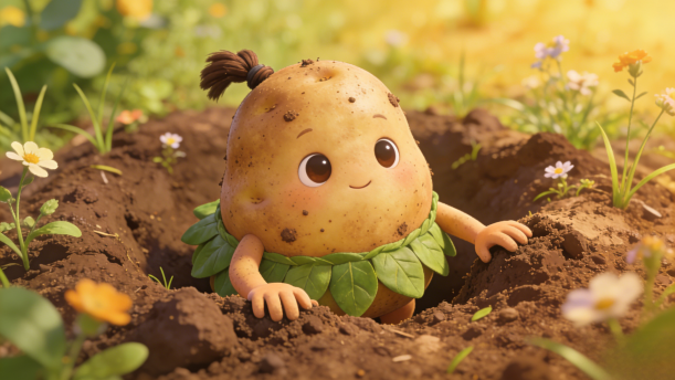 土豆姑娘还在地里长个的时候就爱抱怨:“地下太黑了!什么时候可以离开这鬼地方!”有一天,农民把土豆姑娘挖了出来,啊,阳光耀眼得刺痛了眼睛,可是土豆姑娘兴奋得不得了,她坐上大卡车,被送进超市,摆放在货架上。可是没过多久,她又开始生气了,因为别的土豆把她压在下面,顾客来选购时总是轮不到她。