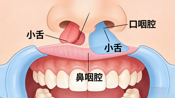 鼻腔位于口腔的上部,鼻腔下底部的硬腭如同一块天花板,天然地将口腔与鼻腔隔成“小阁楼”的“一层”和“二层”。一、二层楼之间的联系由一扇活动的“小门儿”控制,这扇小门儿便是可以挺直或垂下的小舌,它随软腭的升降实现口咽腔、鼻咽腔的切断与对接,决定着口音和鼻音的性质。