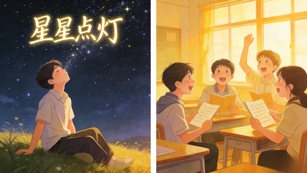 抬头的一片天 是男儿的一片天曾经在满天的星光下做梦的少年不知道天多高 不知道海多远却发誓要带着你远走 到海角天边不负责任的誓言 年少轻狂的我在黑暗中迷失才发现自己的脆弱看着你哭红的眼睛 想着远离的家门满天的星星请为我点盏希望的灯火星星点灯 照亮我的家门让迷失的孩子找到来时的路星星点灯 照亮我的前程用一点光 温暖孩子的心