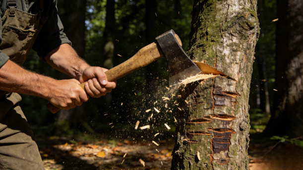 山下传来走路的声音,一个人拿着斧头走进树林,打量着一棵又一棵宽厚雄壮的树,鸟儿们吓坏了,匆忙地从树枝上飞走,失望地喊叫着,林中的和谐一下子就被打破了。突然,那个人停下了脚步,欣喜地望着一棵又大又粗的树,“哈哈!这么大的树,砍掉去卖钱准能赚一大笔!”他从口中拿出一盒烟,抽出一根,放入嘴中点燃,抽烟可以给他带来干劲。“就这一棵了!”他抡起斧子,使劲向树挥去,“啊!好痛啊!”大树绝望地哭喊着,它的身上被砍出了一条裂口,树汁从伤口中涌出。一只啄木鸟闻声飞来,停在了这个人的头上,用尖长的细嘴去啄这个人的脑袋,说道:“这段木头中一定有虫。”这个人完全不知情,继续砍伐大树。小花小草们耷拉着脑袋,怯生生地望着即将倒下的大树,它们害怕极了。“轰”的一声,树林中发出一声闷响,震彻山谷,吓得停在那个人脑袋上的啄木鸟飞走了。树失去了它的生命,倒在了地上。那个人擦了擦额头上的汗,看着那棵已经倒下的大树,笑了,这种笑,不怀好意。