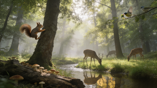 森林里,树木成群,小鸟在枝头歌唱,一副安宁、幸福的景象。树叶挂在枝头上荡秋千,发出“沙沙”的响声;地面上不时有小花小草冒出头来,看着这和谐的世界,“多么美好!”它们兴奋地喊着。