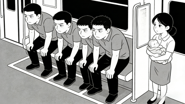 生活中,有一些人愿意当文盲,今天我在书上看到了一幅漫画,它的名字叫做《假文盲》。寒风刺骨的早晨,北风呼呼地吹着。在公交车站牌的旁边,立着一个大牌子,上面写着母子上车处几个大字。可是,我们再往下看,四个身强力壮的大男人站在上车通道上。他们一个个若无其事地站在那儿,却把一位抱着婴儿的母亲挤在一旁。