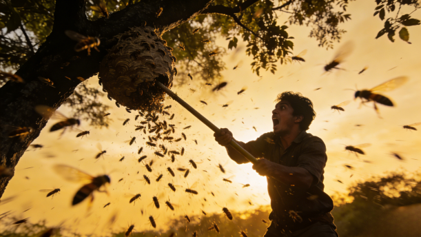 当我的竿头触到蜂窝的一刹那,好像听到爷爷在屋内呼叫,但我已经顾不得别的。一些受惊的马蜂轰地飞起来,我赶紧用竿头顶住蜂窝使劲儿地摇撼两下,只听“嗵”,一个沉甸甸的东西掉下来,跟着一团黄色的飞虫腾空而起,我扔掉竿子往小门那边跑。谁料到妹妹害怕,将门在里边插上,跑了。我一回头,只见一只马蜂径直而凶猛地朝我扑来,好像一架燃料耗尽,决心相撞的战斗机。这复仇者拼死的气势使我惊呆了。我抬手想挡住脸,只觉眉心像被针扎似的剧烈地一疼,挨蜇了!我捂着脸大叫,不知道谁开门把我拖到屋里。