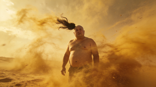 一阵脚步声响起。远处,一个矮胖男人,一摇一摆地走过来。他满脸的肥肉,像两只倒挂的葫芦。 他戴着一只巨大的手套,一身黑色的衣服在漫天的黄沙中走着,似乎是毁灭的代言人。