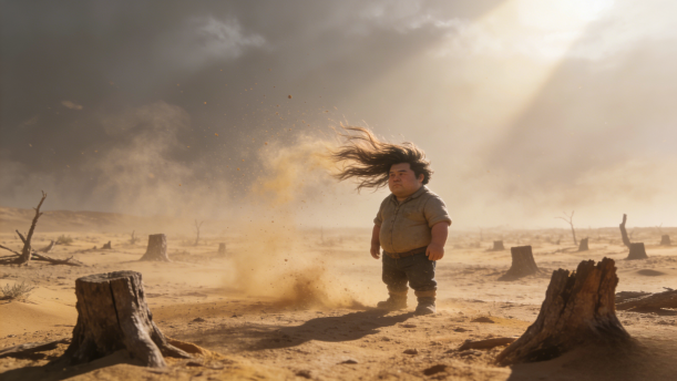 茫茫旷野上,一片寂寥······放眼望去,一个个树桩,直挺挺地站在那儿,一望无垠,延伸至地平线后。这原野上尽是树桩,没有任何的一棵树。斧痕在树桩上清晰可见。黄沙漫天,这曾经的一片绿色被暗黄替代了。这里的土壤,也渐渐地被沙化了。