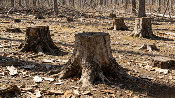 一个个的树桩,长叹一声:“人类啊,为何不懂得保护环境?你们明知道,降临在动植物身上的事总会降临在人类身上!”那男人挥起斧头,砍了下去。