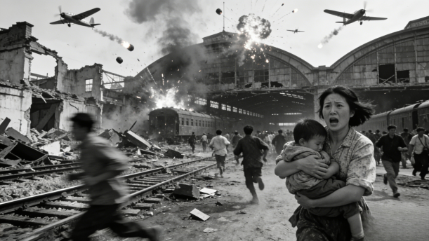 “轰轰——”日本鬼子还在继续轰炸。刚停下的火车被炸开了,惊慌的人们从火车被炸碎的门中、扭曲的窗中挤出。站台上的人差不多跑光了,只剩下一些跑不动的老人、孕妇,以及一些受伤的孩子坐在那里,静静等待着死神“宽大”的怀抱。