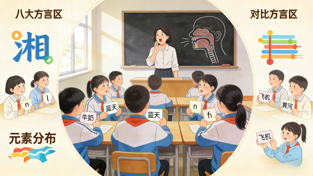 通过湘方言的发音问题针对性训练,让处在这一地区的学生重点体会声母n、l和f、h的发音,改正平时的错误发音习惯。