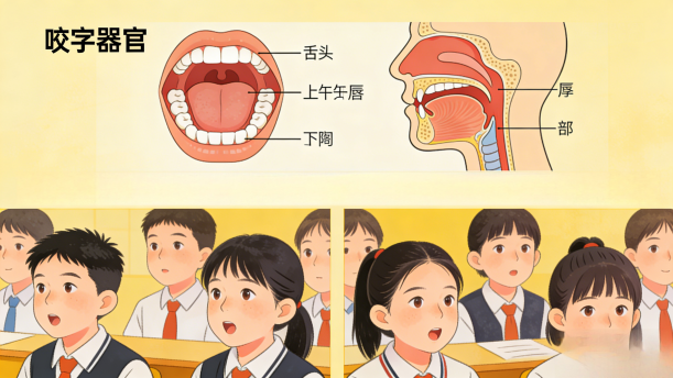 口腔的咬字器官对气流的控制或节制形成了不同的元音、辅音和音节。咬字器官包括双唇、上下齿、舌、硬腭、软腭。其中,唇、舌和软腭在吐字过程中动作最积极,作用最大。