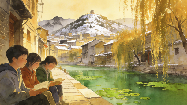 那水呢,不但不结冰,倒反在绿萍上冒着点热气,水藻真绿,把终年贮蓄的绿色全拿出来了。天儿越晴,水藻越绿,就凭这些绿的精神,水也不忍得冻上,况且那些长枝的垂柳还要在水里照个影儿呢!看吧,由澄清的河水慢慢往上看吧,空中,半空中,天上,自上而下全是那么清亮,那么蓝汪汪的,整个的是块空灵的蓝水晶。这块水晶里,包着红屋顶,黄草山,像地毯上的小团花的小灰色树影;这就是冬天的济南。