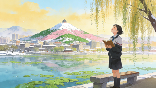 最妙的是下点小雪呀。看吧,山上的矮松越发的青黑,树尖儿上顶着一髻儿白花,好像日本看护妇。山尖全白了,给蓝天镶上一道银边。山坡上,有的地方雪厚点,有的地方草色还露着;这样,一道儿白,一道儿暗黄,给山们穿上一件带水纹的花衣;看着看着,这件花衣好像被风儿吹动,叫你希望看见一点更美的山的肌肤。等到快日落的时候,微黄的阳光斜射在山腰上,那点薄雪好像忽然害了羞,微微露出点粉色。就是下小雪吧,济南是受不住大雪的,那些小山太秀气!