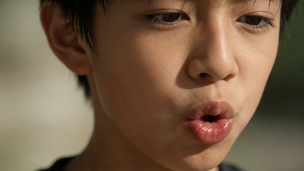 闭唇提颧,上唇向中间收缩,力量集中在上唇中央三分之一段,反复利用气息和双唇的力量将不带元音的b本音发出,如果发得正确应该能感觉到清晰的双唇爆破声响。
