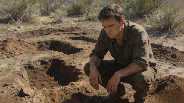 也有不甘心落空的,便驻扎在这里,继续寻找。彼得·弗雷特就是其中一员。他在河床附近买了一块没人要的土地,一个人默默地工作。他为了找金子,已把所有的钱都押在这块土地上了。他埋头苦干了几个月,直到土地全变成了坑坑洼洼,他失望了——他翻遍了整块土地,但连一丁点儿金子都没看见。