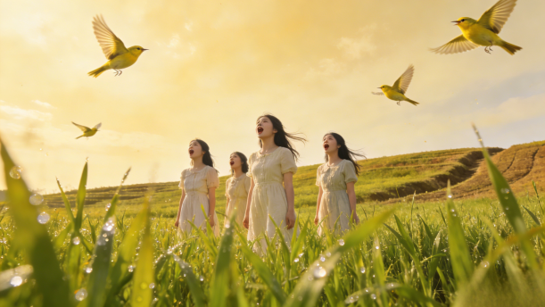 初春,大地从沉睡中苏醒。田野里飘来一阵阵泥土的清香,草儿吐露出娇嫩的幼芽,好奇地窥视着人间;姑娘们穿着艳丽的衣裳,在碧绿色的草地上欢快地歌唱。万木争春,小溪哗哗作响,两岸铺上翡翠般的地毯。举目眺望,大自然一片生机,令人陶醉,使人神往。