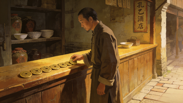 孔乙己是站着喝酒而穿长衫的唯一的人。他身材很高大;青白脸色,皱纹间时常夹些伤痕;一部乱蓬蓬的花白的胡子。穿的虽然是长衫,可是又脏又破,似乎十多年没有补,也没有洗。他对人说话,总是满口之乎者也,教人半懂不懂的。因为他姓孔,别人便从描红纸上的“上大人孔乙己”这半懂不懂的话里,替他取下一个绰号,叫作孔乙己。孔乙己一到店,所有喝酒的人便都看着他笑,有的叫道,“孔乙己,你脸上又添上新伤疤了!”他不回答,对柜里说,“温两碗酒,要一碟茴香豆。”便排出九文大钱。他们又故意的高声嚷道,