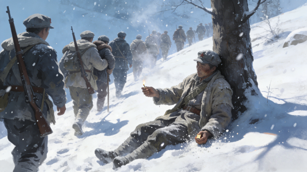将军愣了一下,什么话也没说,快步朝前走去。一个冻僵的老战士,倚靠光秃秃的树干坐着,他一动不动,好似一尊塑像,身上落满了雪,无法辨认他的面目,但可以看出,他的神态十分镇定,十分安详:右手的中指和食指间还夹着半截纸卷的旱烟,火已被雪打灭;左手微微向前伸着,好像在向战友借火。单薄破旧的衣服紧紧地贴在他的身上。