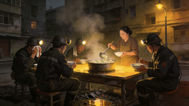 直至有一天,队长刨煤时被哑炮炸成重伤。弥留之际,他对妻子说:“我死之后,你一定要接替我每天去吃一碗馄饨。这是我们队12个兄弟的约定,自己的兄弟死了,他的老婆孩子,咱们一定得帮。”