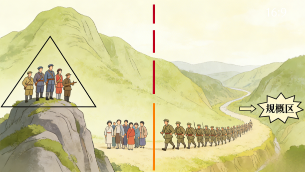 五位壮士屹立在狼牙山顶峰,眺望着群众和部队主力远去的方向。