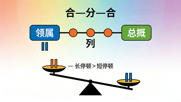 分合性停连是停连十种中的一种,与并列性停连有关,而在并列关系前后,分别会有领属性词语和总括性词语。在领属性词语之后,或总括性词语之前,一般会有较长时间的停顿,比并列关系之间的停顿要长,这样就形成了合—分—合的分合关系,由分合关系形成的停连就是分合性停连。