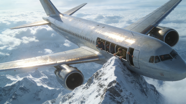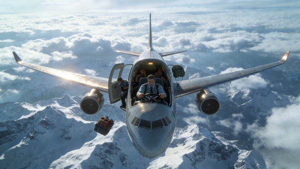 飞机飞得又快又稳。透过云层,可以看到积雪的山峰层层叠叠,好像波涛汹涌的大海。突然,飞机遇到一股强烈的寒流,机翼和螺旋桨上都结了冰,而且越结越厚。不大一会儿,机身也蒙上了厚厚的冰甲。飞机像冻僵了似的,沉甸甸地往下坠,还失去了平衡。机翼掠过一座座山峰,眼看就要撞着山尖了,情况十分严重。机长命令机械师打开舱门,把行李一件一件往下扔,好减轻飞机的重量,还要大家背上降落伞包,做好跳伞的准备。