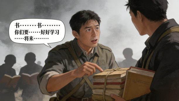 “书······书······”我扶他坐起来,激动地说:“指导员,书都在这儿。走,我背您回村。”他轻轻地摇了摇头,两眼望着那捆书,用微弱的声音说:“你们要······好好学习······将来······”
