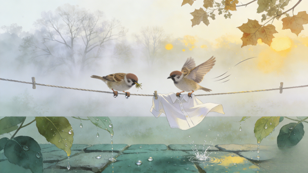 清晨推开窗时,晨雾还未散尽,像一层薄纱轻轻笼着远处的树梢,叶片上凝着的露珠在微光里闪着细碎的光,风一吹,露珠便顺着叶脉滚落,滴在楼下的青石板路上,溅起一小朵转瞬即逝的水花。几只麻雀落在对面的晾衣绳上,爪子紧紧抓着绳子左右摇晃,小脑袋一点一点地啄着翅膀上的绒毛,忽然其中一只扑棱棱飞起,翅膀带起的风掀动了晾着的白衬衫衣角,另一只也跟着窜起来,两只鸟儿在晨光里划出两道灰扑扑的弧线,落在不远处的梧桐树枝桠间,叽叽喳喳地叫着,惊得叶片上的露珠又簌簌落下几片。