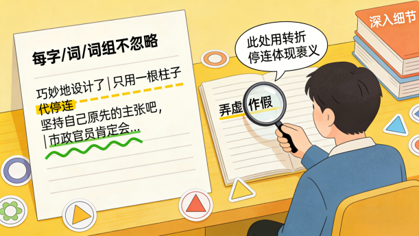 运用我们学习过的十类停连,分析上面的文章,要深入文章的细节中,每一个字、词、词组都不可以忽略。