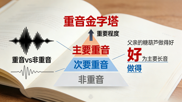 重音体现了词或词组在句子里的重要程度。重音主要强调重要的词或词组,次要的词或词组用非重音。另外,重音也有主要重音、次要重音之分。