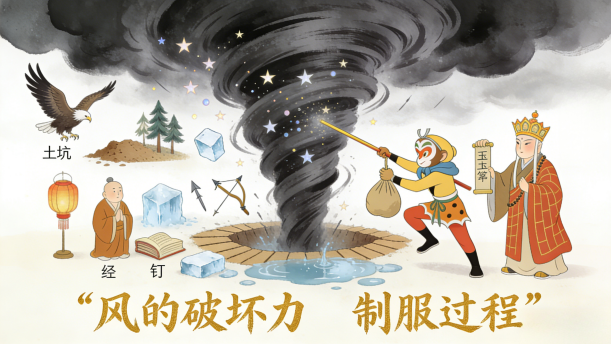 说刮风,就刮风,刮得男女老少难把眼睛睁。刮散了天上的星,刮平了地上的坑,刮化了坑里的冰,刮断了坑外的松,刮飞了松上的鹰,刮走了鹰下的僧,刮灭了僧前的灯,刮乱了灯前的经,刮掉了墙上的钉,刮翻了钉上的弓。只刮得:星散、坑平、冰化、松倒、鹰飞、僧走、灯灭、经乱、钉掉、弓翻还不停,请来了玉皇大帝孙悟空,制服了风婆天下宁。