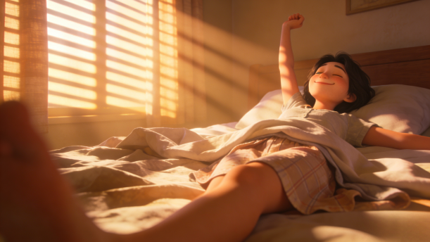早上醒来,阳光透过窗帘的缝隙照在我的脸上,暖洋洋的。我伸了个大大的懒腰,心里美滋滋地想:“太棒啦,今天不用早起上学,想睡到什么时候就睡到什么时候!”我翻了个身,抱着我的小熊玩偶,又闭上了眼睛,享受着这份难得的悠闲。过了好一会儿,我才慢吞吞地从床上爬起来,穿上我最喜欢的卡通睡衣,走到窗边拉开窗帘,哇,外面的天气真好,蓝天白云,小鸟在树上叽叽喳喳地唱歌,好像在对我说:“小朋友,今天天气这么好,快出来玩吧!”我忍不住对着窗外笑了笑,心里想:“今天真是个让人开心的日子呀!”