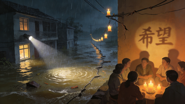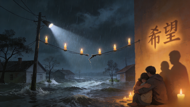 蜡烛可以在黑夜里给我们带来光亮,它也寓意着希望。而洪水是一种自然灾害,有些人可能会在洪水中丧命。洪水来了,切断了所有的电,这时候蜡烛就派上了用场,它也为处于灾害中的人民带来了一丝希望。