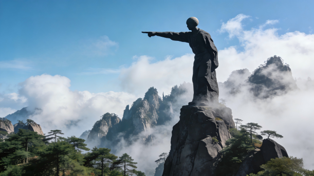 在一座陡峭的山峰上,有一只“猴子”。它两只胳膊抱着腿,一动不动地蹲在山头,望着翻滚的云海。这就是有趣的“猴子观海”。