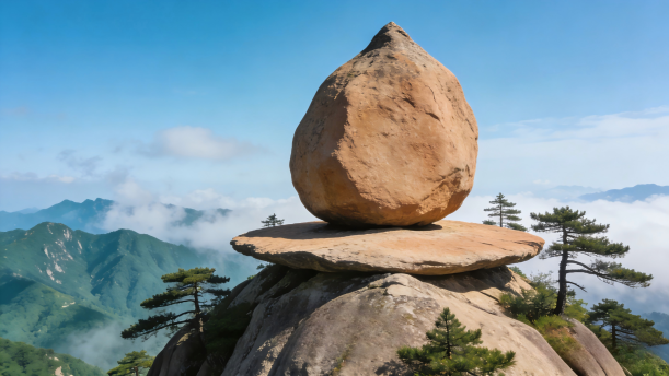 就说“仙桃石”吧,它好像从天上飞下来的一个大桃子,落在山顶的石盘上。