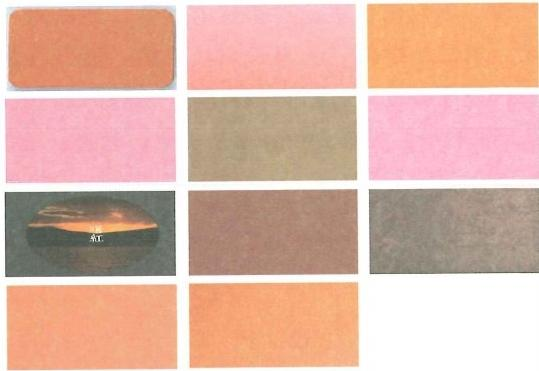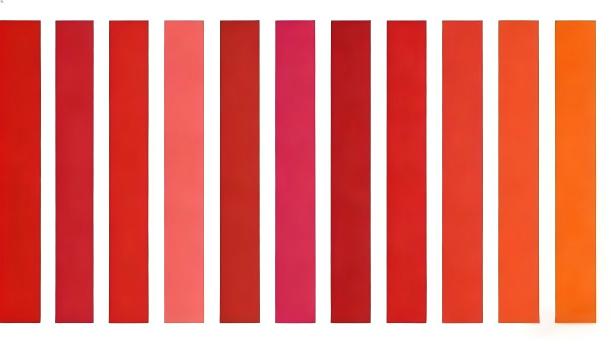 上面11幅图的颜色从左到右分别是大红、玫瑰红、朱红、桃红、土红、洋红、曙红、胭脂红、牡丹红、妃红、橙红,学生要能清楚地认识这些红色。