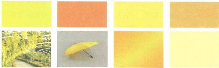 1.上面8幅图的颜色从左到右分别是柠檬黄、橘黄、鹅黄、土黄、藤黄、亮黄、金黄、淡黄,学生要能清楚地认识这些黄色。