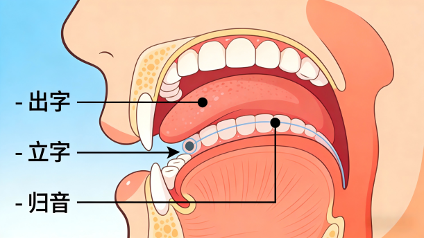 在吐字过程中,对音节头、腹、尾的处理,分别叫出字、立字、归音。其中,出字要做到有力,叼住弹出。