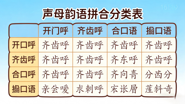 开口呼:ba pa ma fo da ta na la ga ka ha zha cha sha za ca sa de te ne le ge ke he zhe che she re ze ce se
