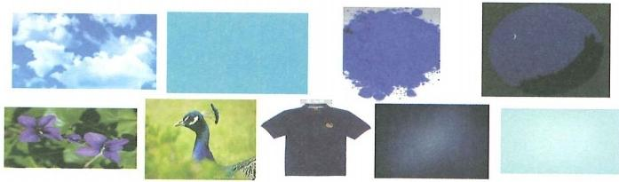 1.上面9幅图的颜色从左到右分别是天蓝、湖蓝、群青、酞青蓝、紫罗兰、孔雀蓝、海军蓝、深蓝、浅蓝,学生要能清楚地认识这些蓝色。