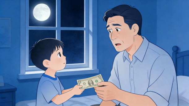 “哦,”小孩低下头,接着说,“爸,可以借我十美金吗?”父亲发怒:“若借钱买无意义玩具,回房间睡觉,想想为何如此自私,我每天辛苦工作,没时间玩你的游戏。”小孩默默回房关门。父亲平静后,觉得可能对孩子太凶,或许孩子真想买东西且平时很少要钱。父亲进孩子房间问:“你睡了吗?”“爸,还没,我醒着。”孩子答。“我刚才可能对你太凶,”父亲说,“我不该发那么大火,这是你要的十美金。”“爸,谢谢您。”孩子高兴地从枕头下拿出皱钞票数。“你已有钱为何还要?”父亲不解。“因原来不够,现在凑够了。”孩子答,“爸,我现在有二十美金,可以向您买一小时时间吗?明天请早回家,我想和您一起吃晚餐。”