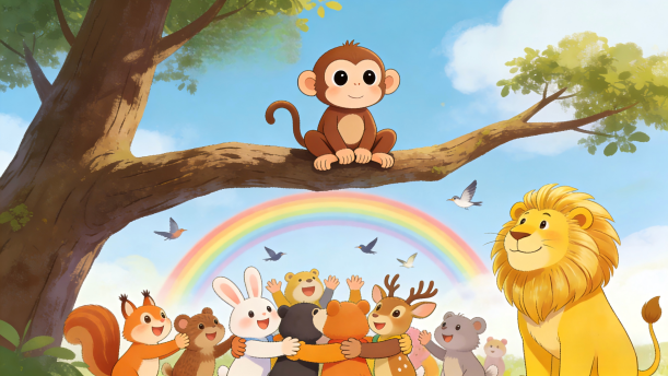 狮子见了,笑眯眯地说:“不用再往下轮了。我郑重宣布,从现在开始,小猴子就是‘万兽之王’了!”