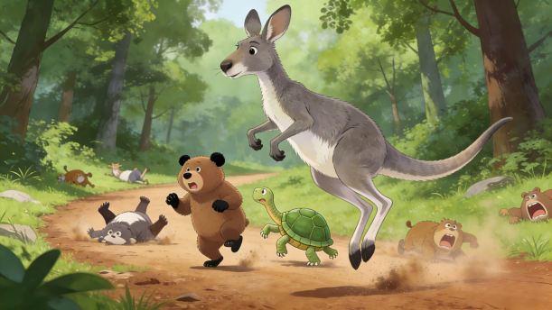 第二个星期,轮到袋鼠上任了。他激动地说:“从现在开始,你们都要跳着走路!”听了袋鼠的话,大家直摇头。可是又不得不服从命令,只好苦练跳的本领。