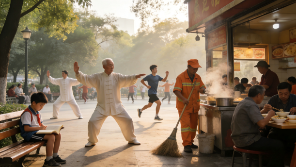 公园的早晨是热闹的。老年人在优美动听的古典音乐声中打着太极拳,悠然自得;年轻人在做操、跑步,每个人脸上都挂满了汗水;小学生坐在长椅上晨读,充满了青春的朝气;环卫工人正在忙着打扫卫生,为公园一天的清洁做着努力。公园里卖早点的店铺也热闹非凡,坐满了吃早饭的人们。