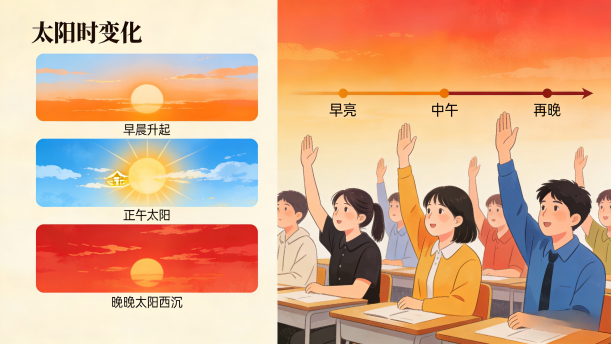 2.太阳每一天都是遵循同样的轨迹运行的,说一说早晨、正午和傍晚时太阳的不同吧!